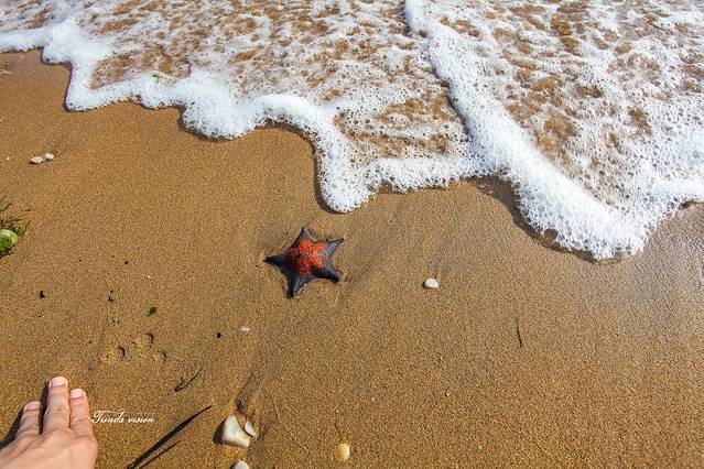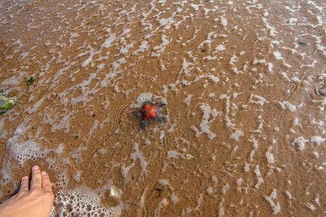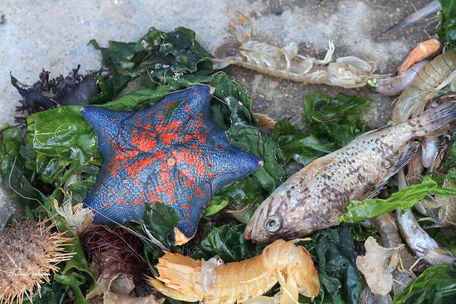 渔港码头上渔民扔掉的海鲜,有海星、小黑鱼、皮皮虾,竟然都是活的。咱可想把那只蓝色的海鲜给拎走了,可惜是活的,媳妇吓的就是不敢拿那个玩意,好吧算了,黏糊糊的还是活的万一咬咱一口可咋办。