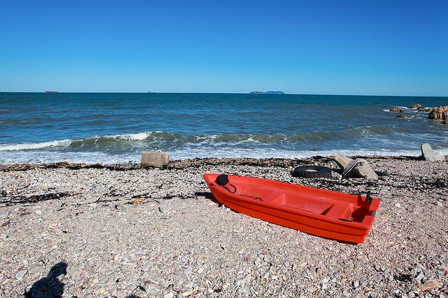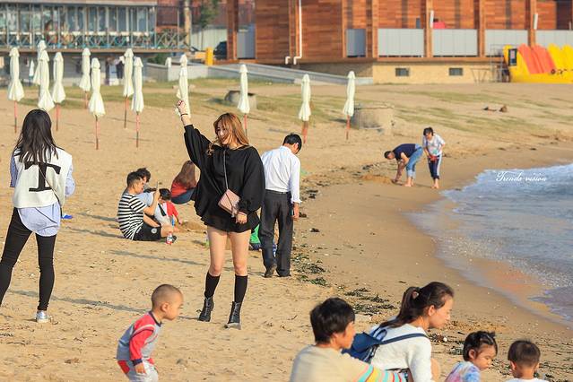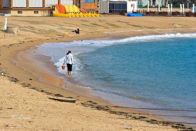海上浴场是一个商业化的海滩,完全人造的海滩,也是长岛的细沙沙滩,细沙滩下仍然是长岛的经典球石,这个沙滩旁边有一个明珠广场,小吃一条街,旺季的时候非常热闹。而现在这个时节,人迹罕至,无处吃饭,什么人都没有,偶尔有几个游客来这片沙滩上转转。
