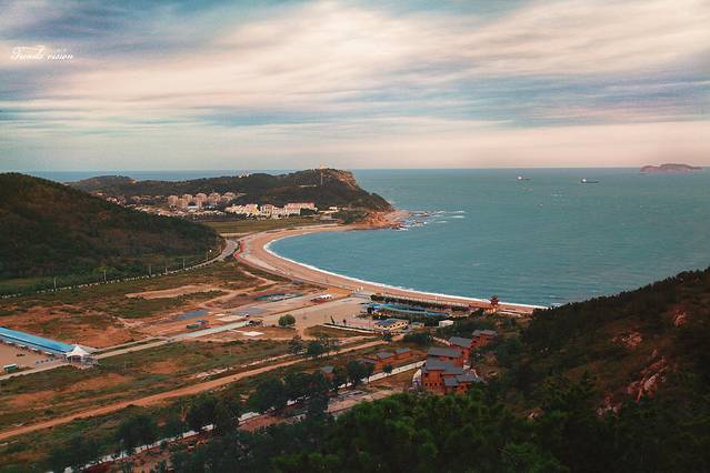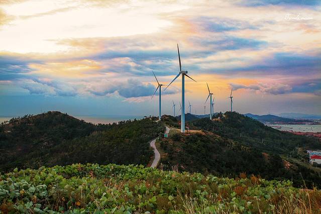 奇石滩,从两个风车之间顺山路下到奇石滩,沿着环路绕过大顶山、羊鼻子山、北山、海螺山、太平山,至长岛水产园的海港。一路都有非常不错的风光。由其在傍晚走到南岛与北岛之间的大桥旁边的渔港码头,我们发现了一个鸽蛋卵石海滩,海水清澈见底,岸边是满目的卵石个个如鸽蛋大小,被海浪淘洗的圆润光滑,而且最为重要的是这里竟然没有人,只有我们两个人,这么美的海岸竟然被我们承包了。到这里的时候正好落日,金红色光影笼罩下的鱼港,海岸上停泊着几艘渔船,落日红着脸蛋沉入山涯,简直美的一塌糊涂。
