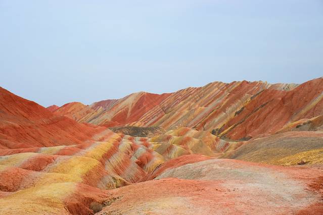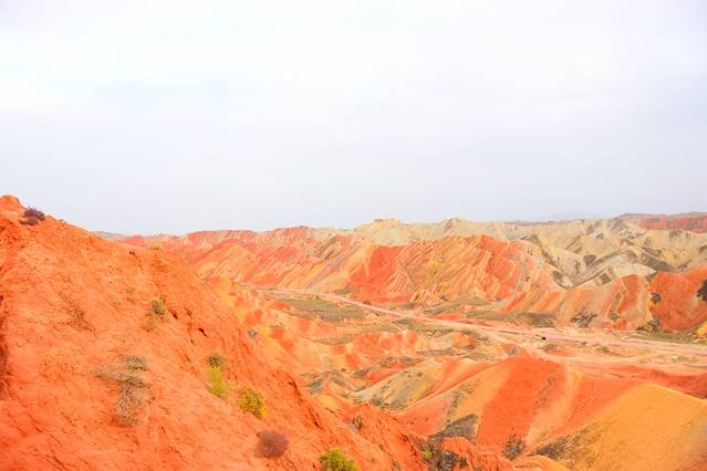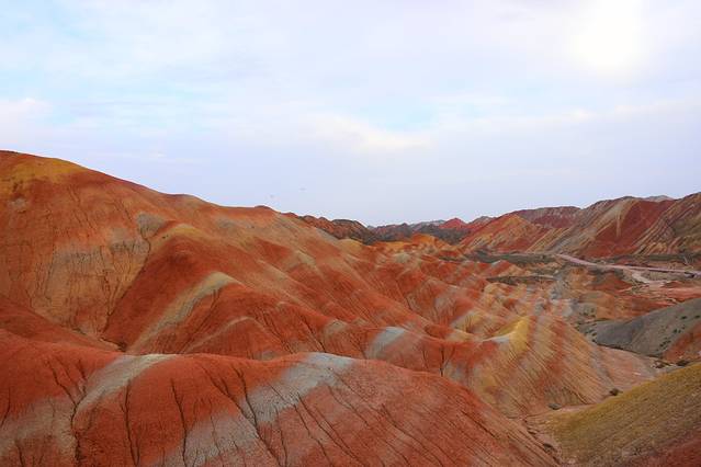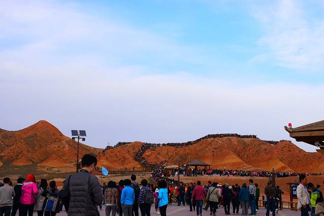 一路赶到张掖,趁天黑前去看丹霞地貌。门票是75块钱,然后进入景区都是有大巴车接送,接送到一个观景台的。一共有5个观景台。每一个人人都很多很多,听说4号观景台可以看日落,所以就直奔第四个去了,大巴车是有分你是东门北门西门进的,记得看清楚,因为每个门的参观路线不一样不走回头路的。