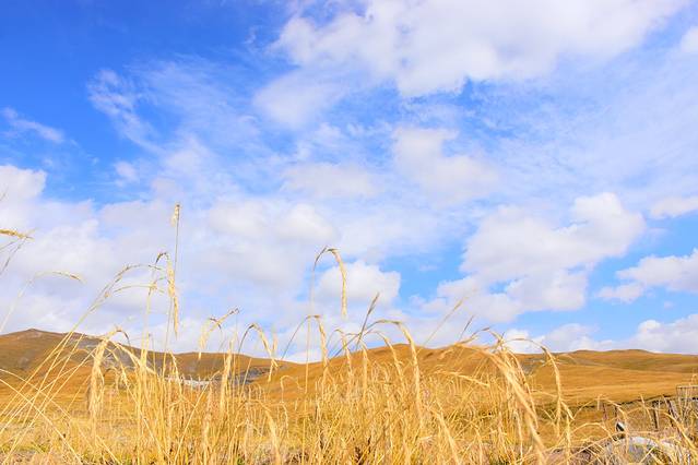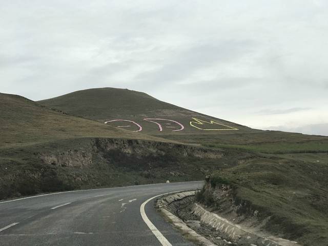 公路上的各种跳,到这里后,天气就非常的好,很晴朗了。一路群山围绕。视野也很开阔。