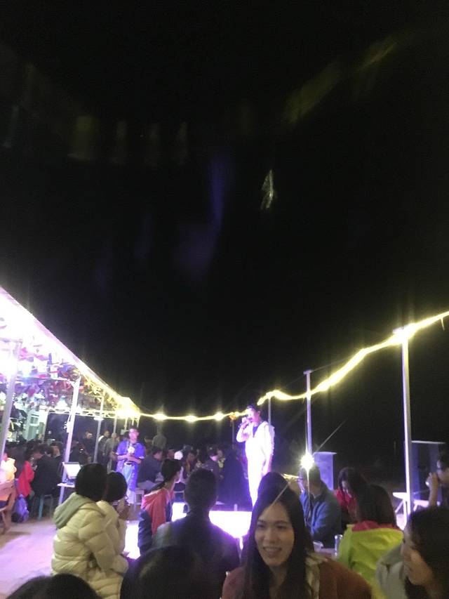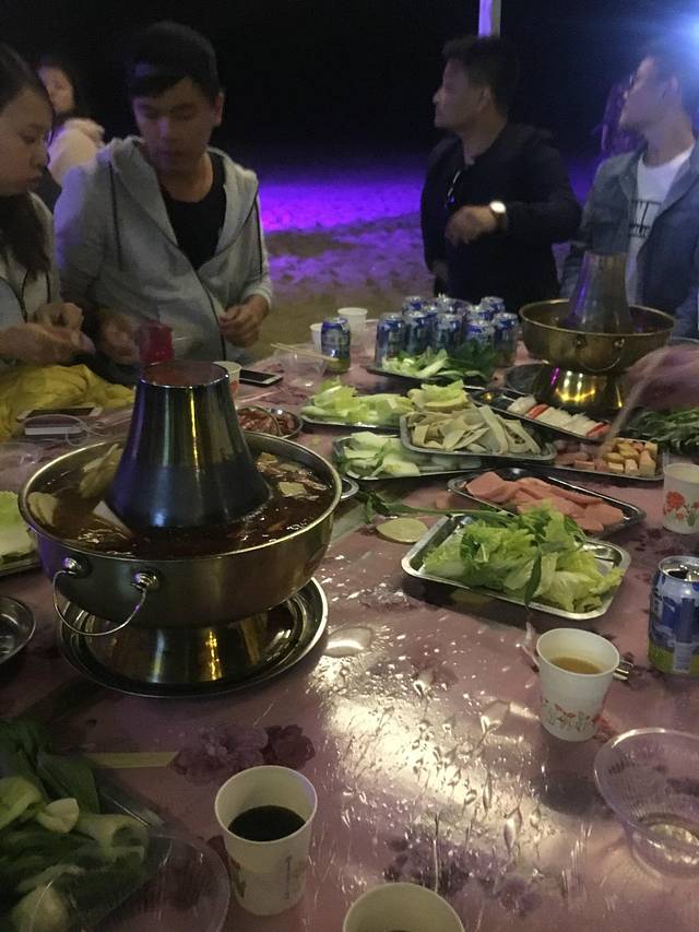 火锅。篝火晚会,吃的很一般,没有肉,都是菜,吃泡面吃饱的。哈哈。主持人很high,来自五湖四海的人,东北女汉子真的好豪爽。各种唱歌哈。饮料,啤酒,水果免费吃到饱。然后一人一小串羊肉串,除了丸子,没有其他肉了。这200真的是太暴利了。一桌15个人。不过吃包了就行。还是挺开心的。