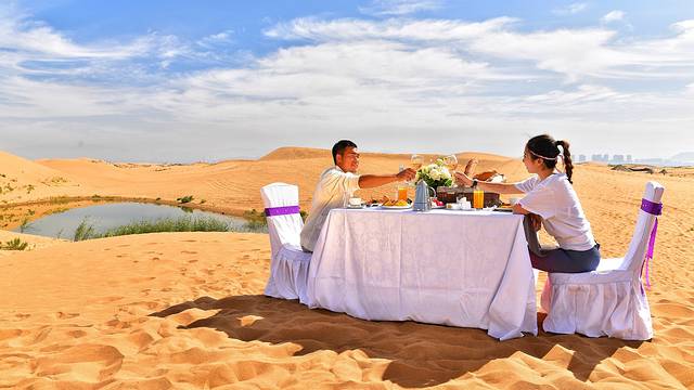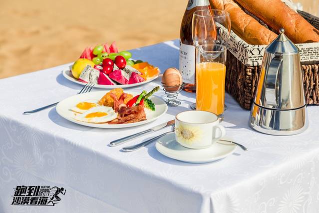 跑完步,就地在乌海湖旁的沙漠中,伴着远处的湖景城景和甘德尔山,来一顿丰盛的营养早餐。