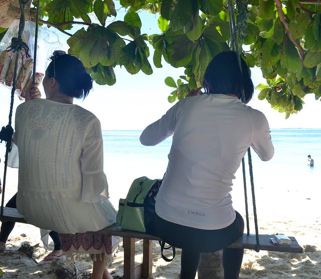 午饭时,坐在树荫下的秋千上,听着音乐,听着海浪声,看着天空和大海,很舒服!此时此景,只想让时间定格。