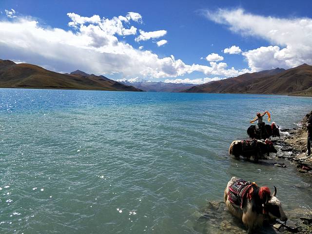 湖边上有藏民放着牦牛让大家拍照赚取费用。