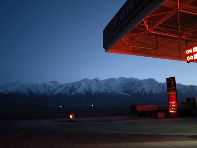 中间加油,远处的雪山并不见得有多巍峨,但美。晚上八九点才到格尔木。