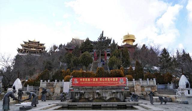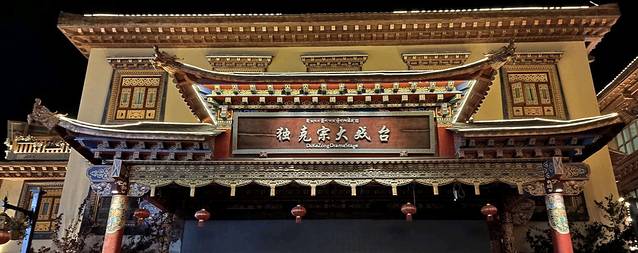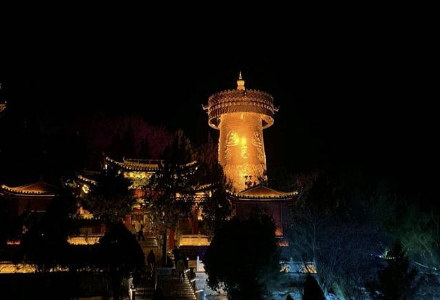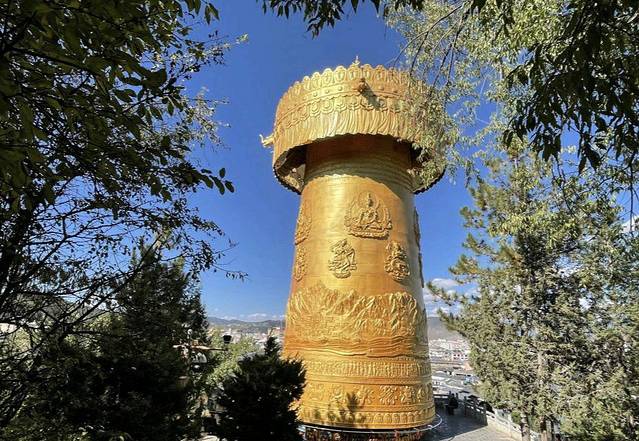 在古城龟山上,除了大佛寺之外,还有一个世界上最大型的转经筒。高达21米、总重60吨,是世界上最大最重的镏金纯铜转经筒,它是香格里拉独克宗古城的著名打卡点。想要转动这座巨型转经筒,必须要多人合力才能完成,所以大家来了一定要转一次。