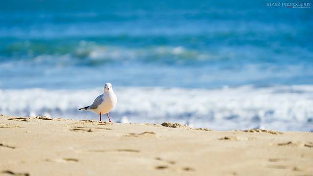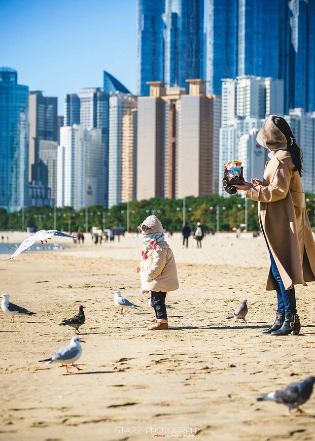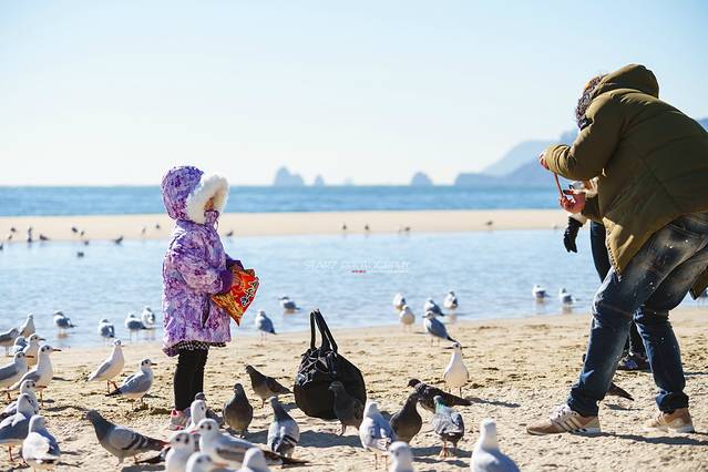 趁着天气晴朗,在海云台海水浴场有不少大人带着孩子过来玩耍,喂喂海鸥,拍拍照,看那手上拿着一包虾条的小女孩正喂着海鸥,她的父亲忙着用手机记录下女儿的可爱的瞬间,享受感恩上天赋予的小幸福。