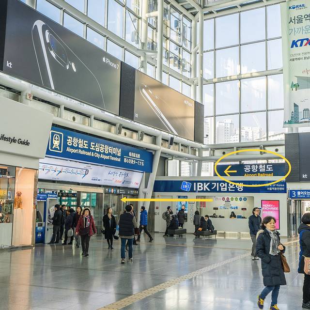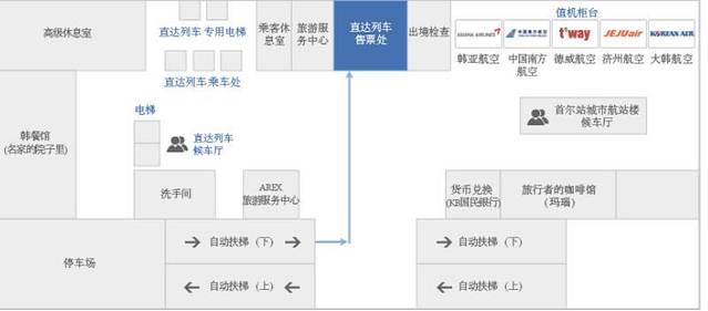 到达首尔站一层,然后往里面走,会看见“Airport Railroad”的标识,从一层坐扶手电梯下至地下2层。