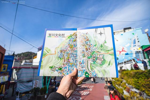 在甘川文化村入口处的向导中心可以购买一份向导地图,价格2000韩元,地图上提供观光的路线图和甘川文化村的由来简介,同时背面还有图章的盖印处,可以边游览边寻找盖章的景点,蛮有意思的!