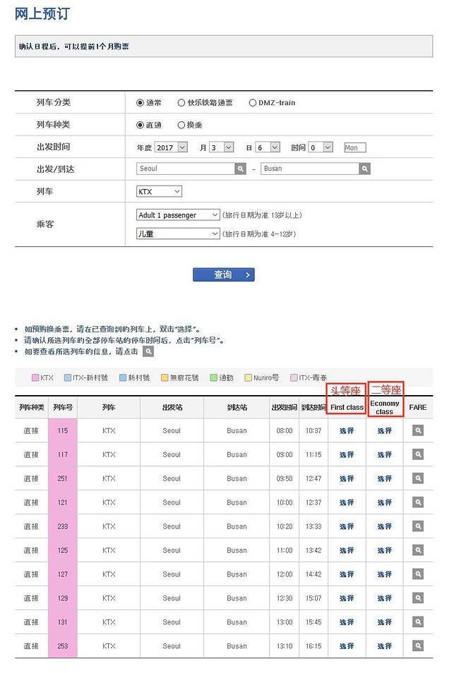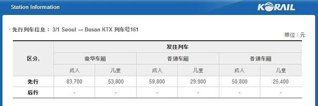韩国铁路网站提供中文服务,非常人性化!用户只需选择好出行的时间、出发/到达城市、列车种类和乘客数量就可以查询列车的车次详情等信息,最后根据个人经济能力去选择坐席,然后确定。