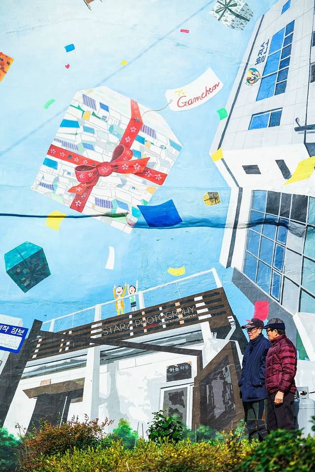 甘川文化村内都充满着艺术气质,许多独特的艺术作品呈现在村内各处。其中<上天赐予的礼物>印象非常深刻,描绘收到上天掉下来的礼物的人们随着音乐快乐起舞的画面。这是一种儿童幻想的世界,欢乐、幸福及和平。