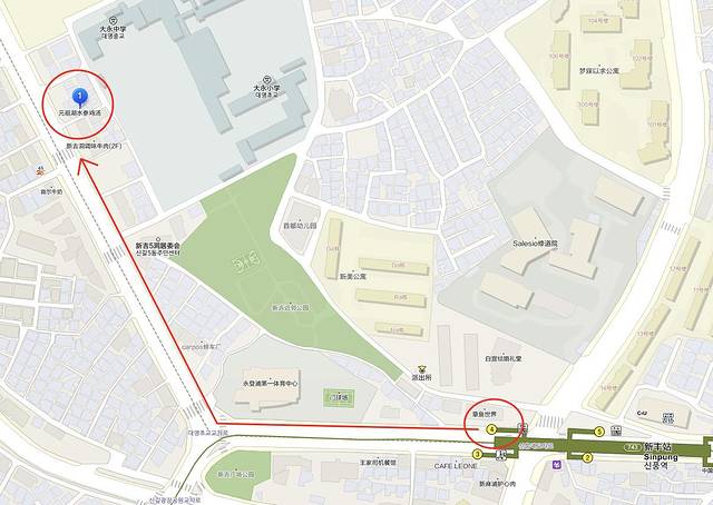 地 址:首尔特别市永登浦区新吉洞 342-325 (永登浦区道林路274-1) 地铁新丰站4号出口直走150米,然后路口向右一直走250米便能到达。