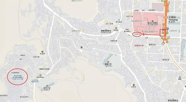 交 通:乘座地铁1号线在土城站6号出口出来,直走至釜山大学医院癌症中心前换乘小巴沙下1-1,西区2,西区2-2 都可以到达,大概乘坐十五分钟就抵达甘川文化村站,这站比较多人下车,千万别低头玩手机哦! ヽ(●-`Д´-)ノ