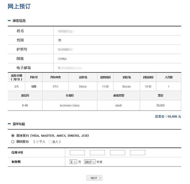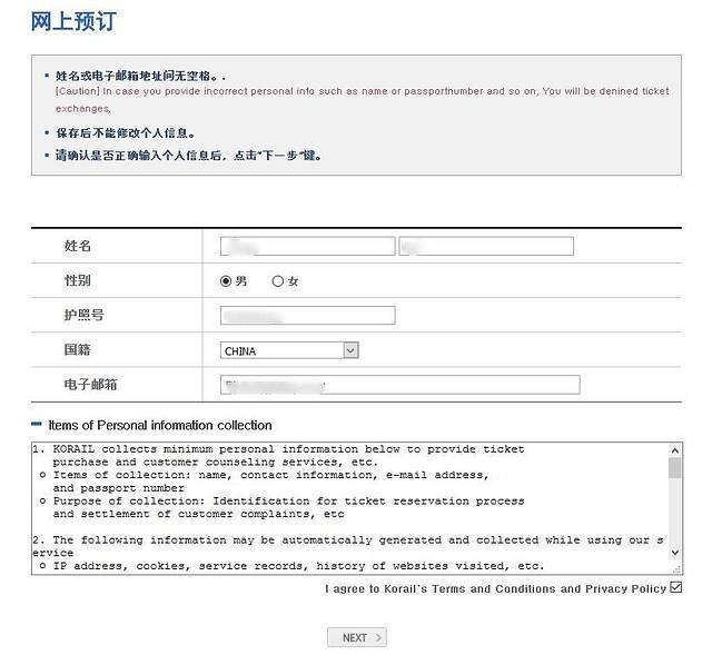 填写个人信息时,请按照护照上的英文姓名去填写,切勿填写中文!!(韩国人怎么可能看得懂)最后一定要留下可以查收邮件的电子邮箱,因为预订的车票回执需要打印备用。