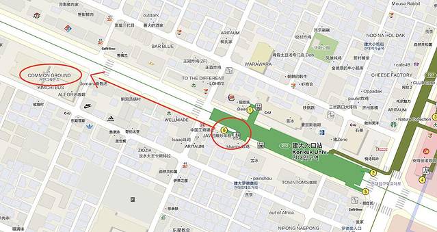 弘益大学步行街范围指示图(红色涂鸦位置)。每周六在弘益公园还有创意市集哦!