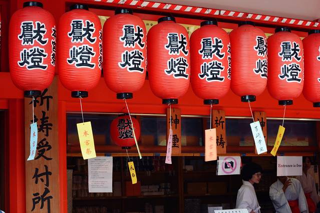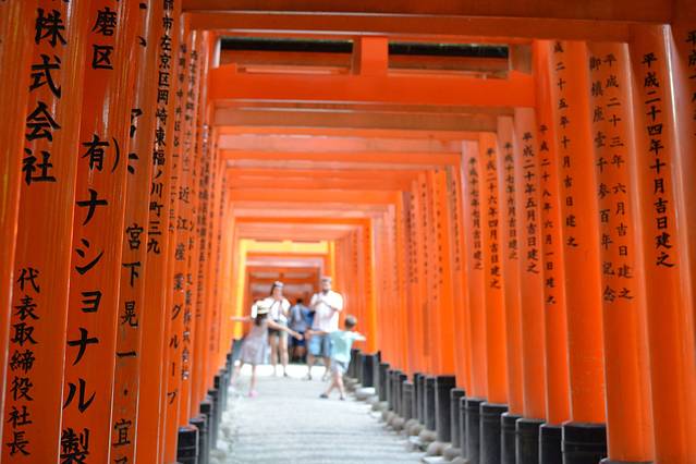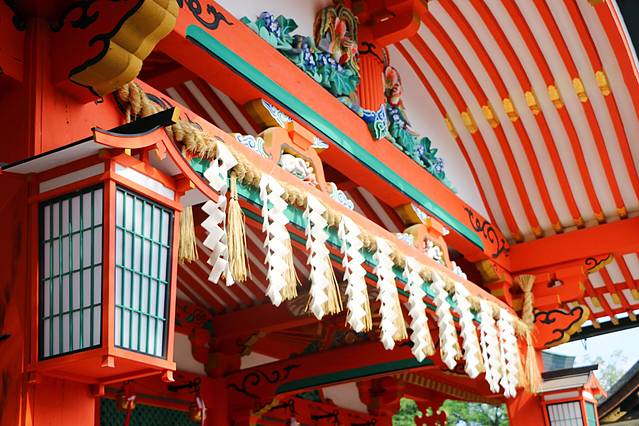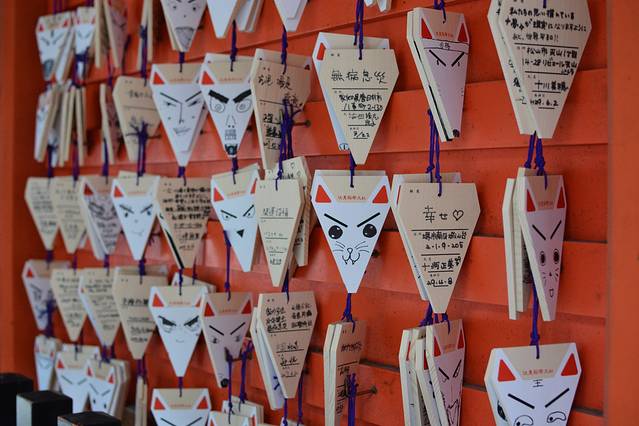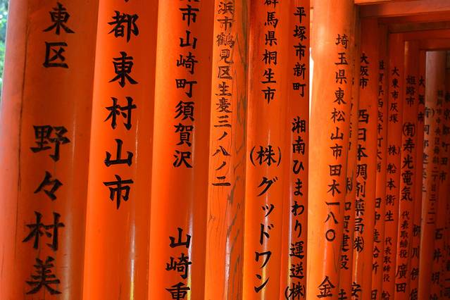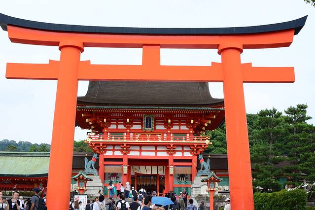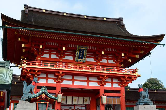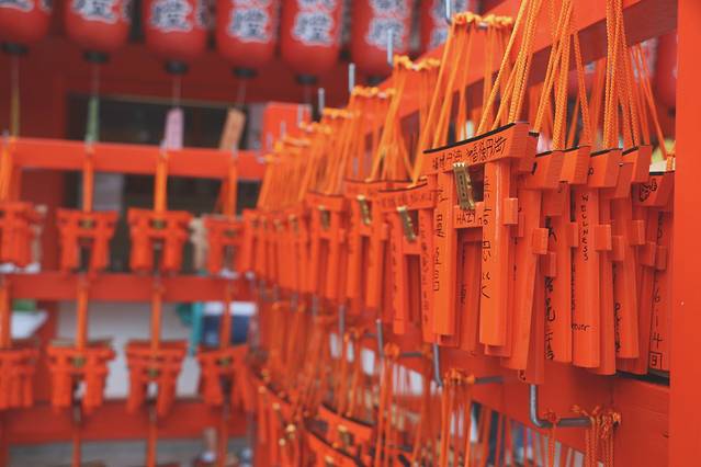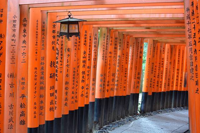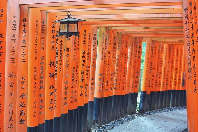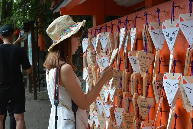 伏见稻荷大社由秦氏家族修建于8世纪,是主要用于供奉稻荷神的神社建筑群。随着农业生产在社会中首要地位的衰退,这里被赋予了保佑商人生意兴隆的神力,所以如果想在这里祈愿,主题最好与自己的财运有关。而被日本人看做神圣又神秘的狐狸,则是稻荷神的使者,数以百计的狐狸石像遍布整个神社,它嘴里含着的则是用来开启谷仓的钥匙。