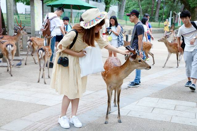 奈良公园,一个现实生活的童话世界,在这里,只要有一块小小的鹿饼,你就是超人气偶像,不用其它才艺,借机你还你可以轻轻的抚摸他们的鹿角,顺便拍几张有爱的照片。小鹿的一切是鹿饼,而当下你的一切是快乐。