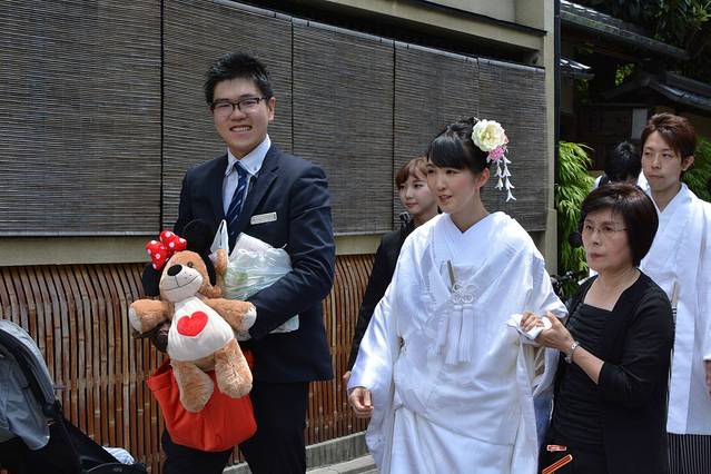 路上巧遇一对新人结婚,新郎脸上洋溢着幸福的笑容。新娘穿着日本传统服饰,白色象征着纯洁。后面跟着的貌似是伴郎伴娘,他们的衣服颜色是反过来的。