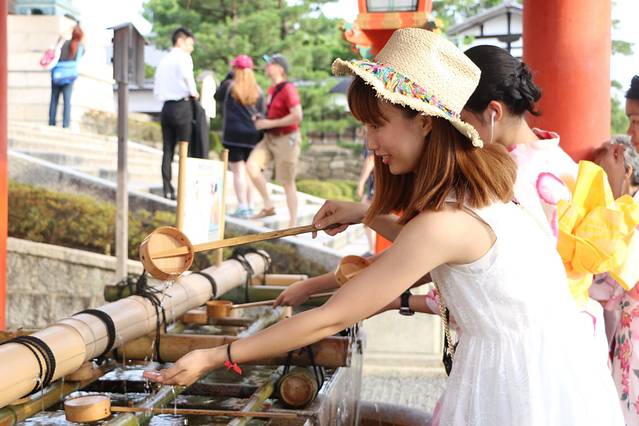 每座神社都设有洗手池,在参拜之前,要洗净双手并漱口,代表净身,以显示对神灵的尊敬。洗手的步骤也很讲究,通常来说洗手台边都会贴有示范图。首先,你要先用右手拿起勺子洗左手,然后再用左手拿勺洗右手,将水倒入左手掌心用来漱口,将勺子立起,剩余的清水至上流下清洗勺柄,最后将勺子摆回原位。需要注意的是,上述步骤用的都是同一勺水,漱口时不可将漱口水喝下。这些繁文缛节无一不体现出日本人从骨子里散发出来的细腻和对神灵的敬畏。
