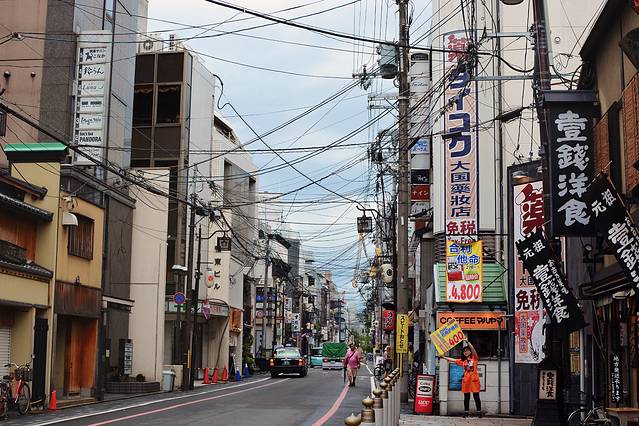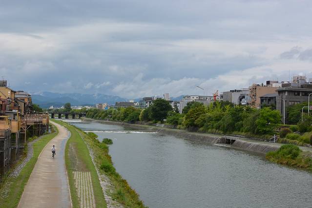 睡到自然醒,开始漫游京都之旅,穿过繁华的商业街,便能到达鸭川,听说站在桥上,在天气好的时候能够看到若隐若现的富士山。我们碰上阴雨天,没有看见