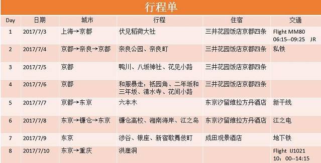 第一次去日本,又想着能尽可能的多去一些地方,把关西和关东大致都走一遍,但对于我们只安排了7天时间还是有点赶的,不过好在日本的交通相当便利,此次日本行大阪进,东京出,全程不走回头路。参考了大家的攻略,大阪没有亮点的地方了,繁华不如东京,韵味不如京都,因此我们没有在大阪停留,下飞机直接乘JR到了京都。具体行程如下: