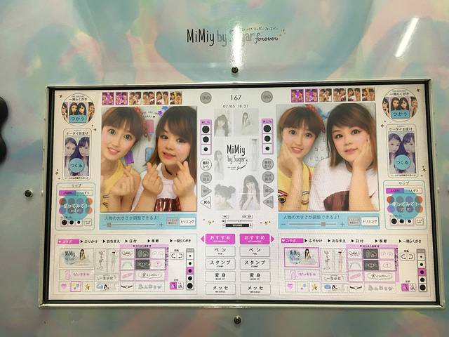 逛到一处拍大头贴的地方,看见几个萌萌的日本中学生在拍照,我们也忍不住去尝试。刚开始不知道如何操作,语言交流有障碍,全程用有道翻译官翻译,还好友善的小女孩们耐心的教我们。第一次尝试是失败的,倒计时太快了,6秒就开拍,完全还没准备好就拍,而且拍好了还不能修改,拍出来的照片我们不满意。于是我们进行了第二次尝试。。。READY GO。。。