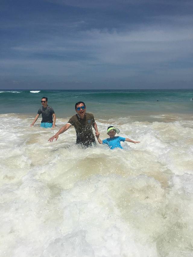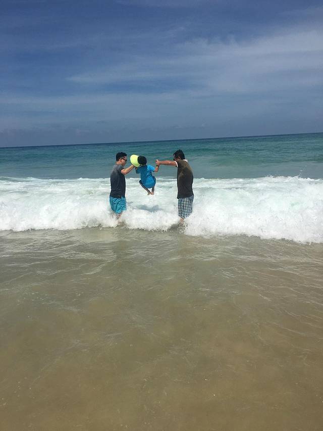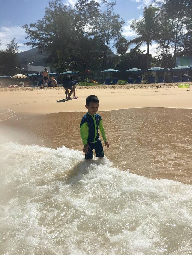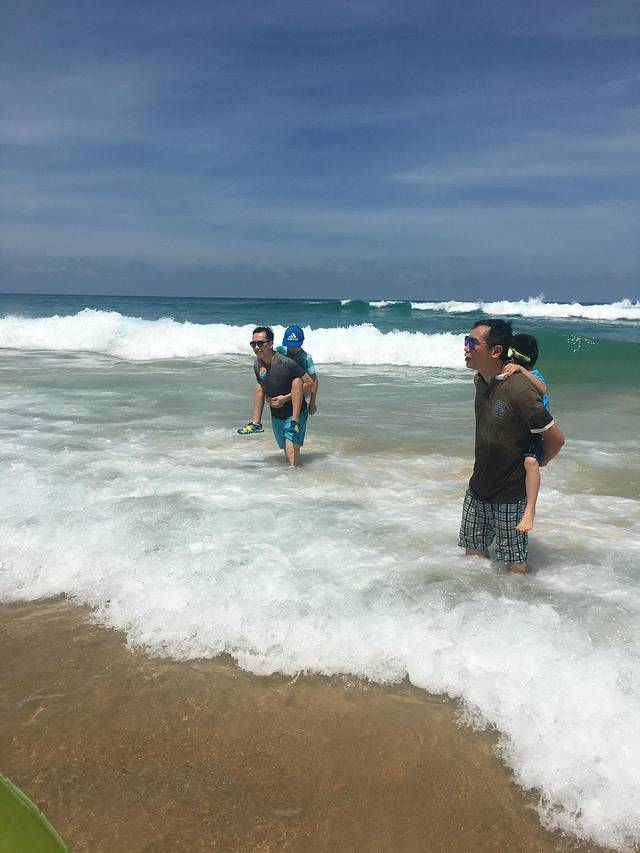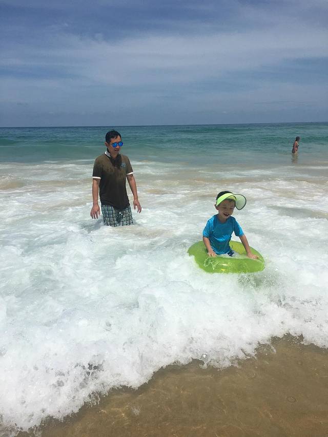 回去酒店粑粑和宝贝都起床了,洗漱和早餐后,我们换好衣服,防晒墨镜帽子全服武装好了,和哥哥伯父他们全家人一起再去海滩。这次就真的玩的可嗨了。海滩浪越来越大, 人也越来越多,很多欧美的游客走的比较外面,随着海浪翻过,看得都很过瘾,我们就不敢了。