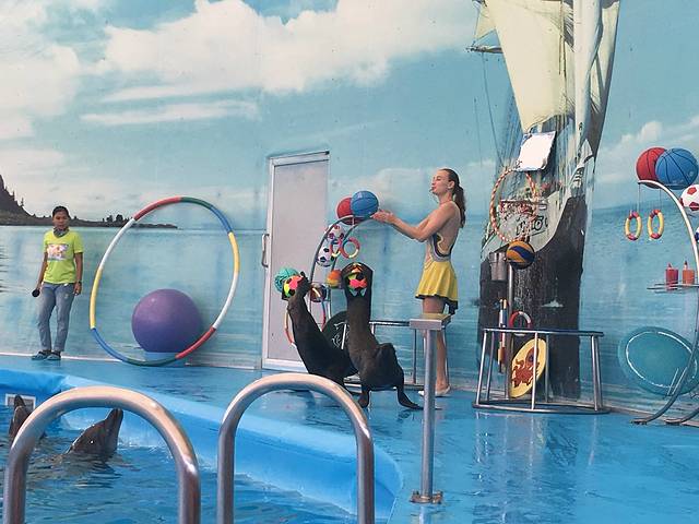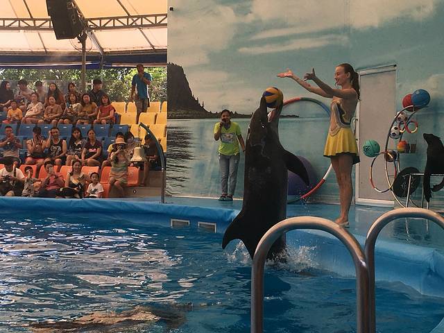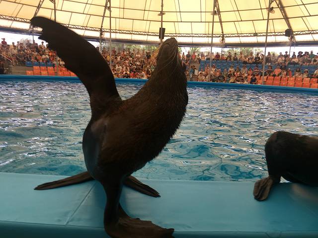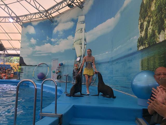 表演开始了,海豚海豹和训练员相互配合,演出精彩,拍手叫绝啊。岸上的,泳池里的,顶球,飞跃等高难度动作都难不倒可爱的海豚啊。后面还有跟海豹来个近亲密接触,直接站上我的大腿,那是有点惊吓了!