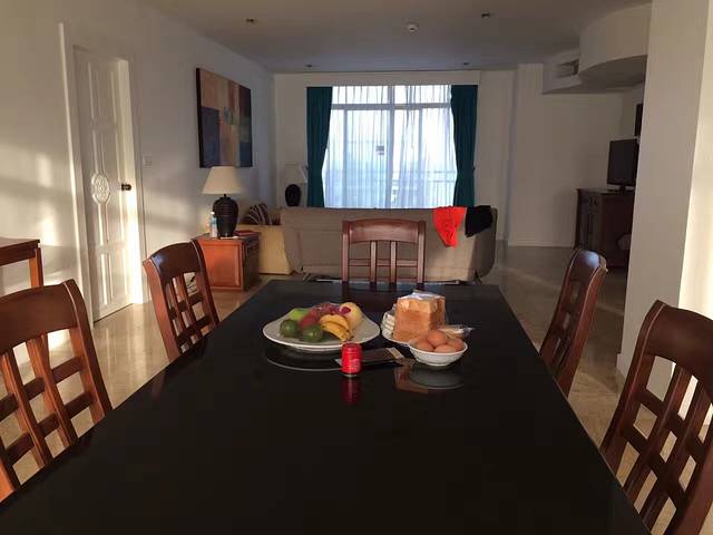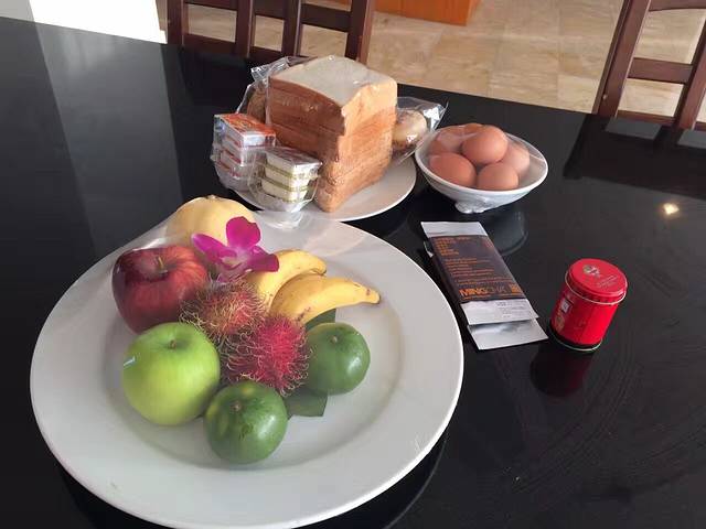 饭厅的餐桌上放着欢迎水果,面包,鸡蛋和冰箱里都有牛奶果汁,很棒。