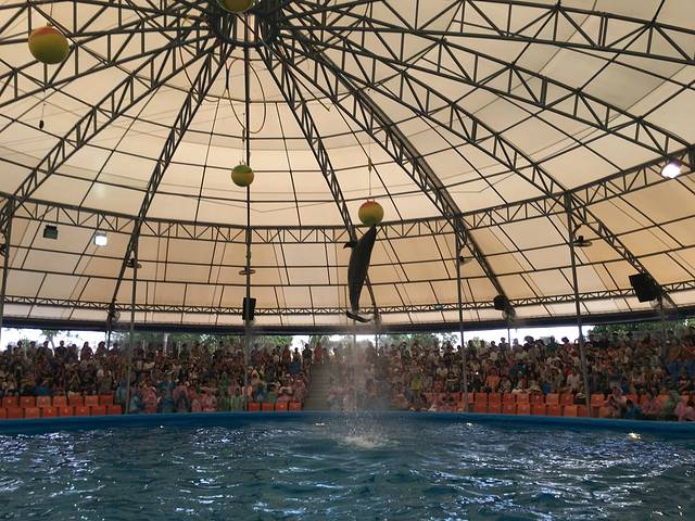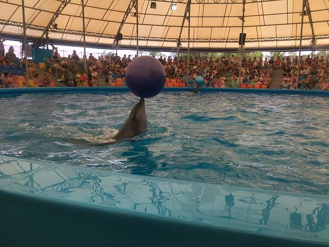 海豹岸上表演完后,就到海豚出场了。顶着个球游了几圈。