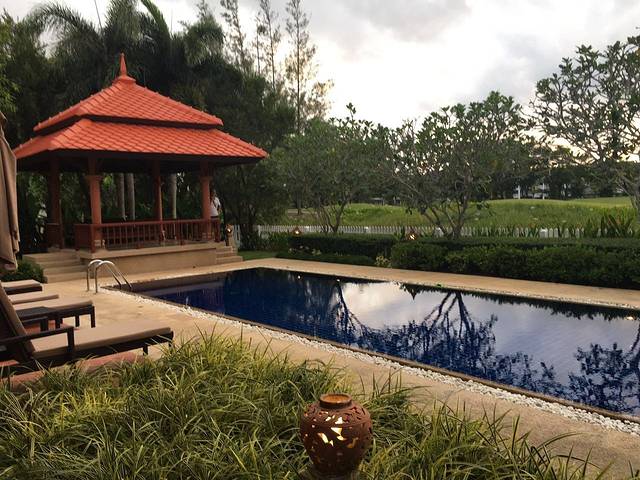 客厅出来有躺椅,太阳伞,儿子最爱的私家泳池,凉亭,栏杆外面就是草地,早上看到有员工在浇水修剪等。