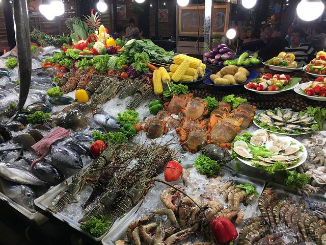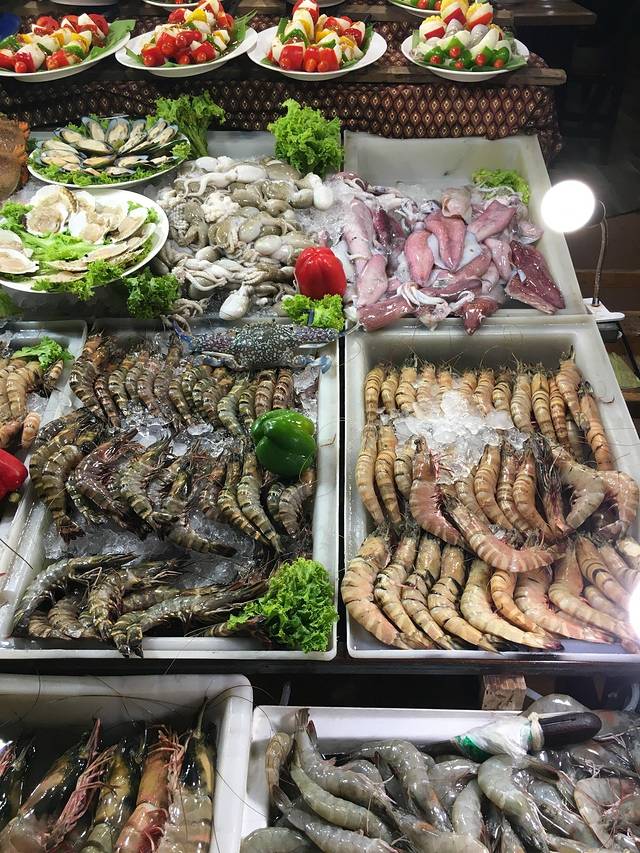 很多海鲜啊,但不怎么便宜,而且大部分是冰鲜,当然是没有昨天的拉威海鲜市场划算了。