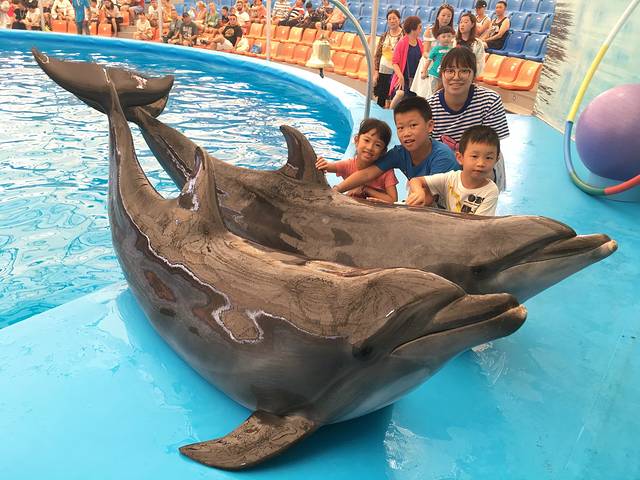 吃完自助早餐后我们3位妈妈带着3个小朋友去海豚馆睇表演,按照约定的时间来到悦椿酒店大堂,来接送我们的是一辆9人左右的面包车。网上预定挑选了很久,因为很多没有包含我们住这个地区的接送,后来找到一家180元左右一位包接送的性价比挺高的,我们订的是VIP排很近泳池的位置,配了雨衣,这很有必要,真的会湿身的!