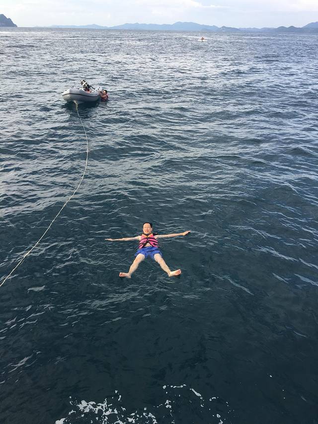 排队登船后,原来还不是马上开船回程的,还有海上活动,大人们可以穿救生衣下海畅游,我们不敢下水的,看着几个男女犹豫着是否下水,就刷的一声被船员推下去了,吓死人了。我们勇敢的伯父就下去了。接着小朋友们可以到大大的游泳圈上玩,看着哥哥姐姐下去了,宝贝也坐不住了,既害怕又兴奋的,在伯父的帮助下也下去大泳圈了,玩了大概20分钟,大伙都上船回程了。