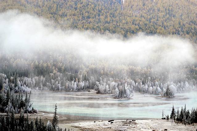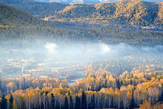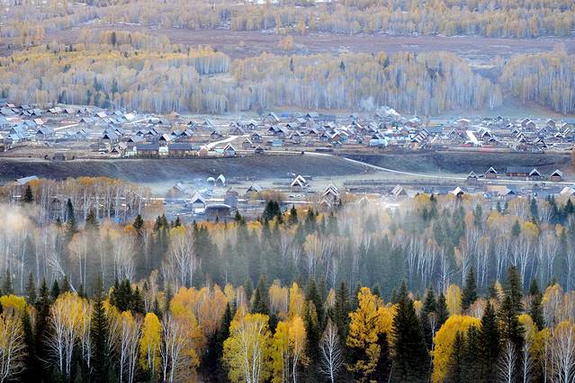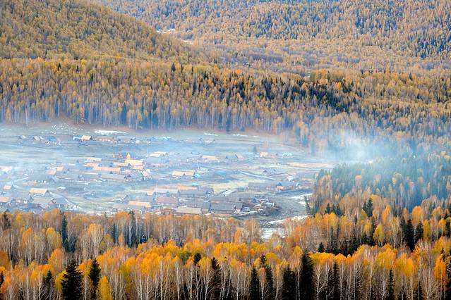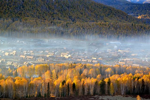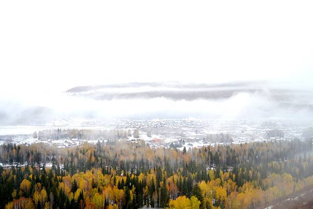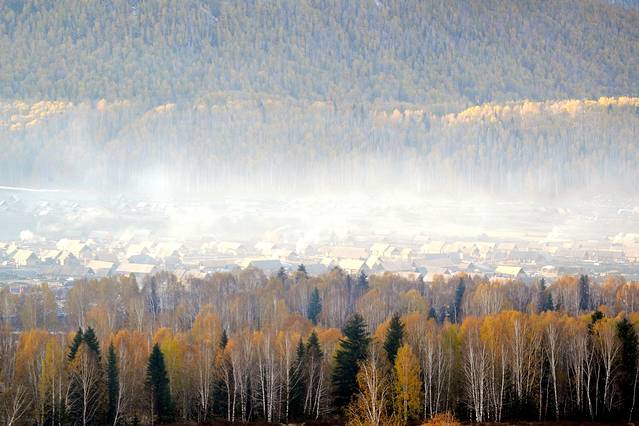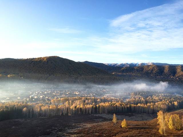 看完日出,就可以安安心心的坐车去了,即使没有班车,即使我们坐着高价的拼车回布尔津,都觉得一切都太值得了,天气好的禾木晨雾,像是游戏宣传片一样的。给小伙伴W发去了今天早上的晨雾视频,本来昨天都还在犹豫要不要走,今天看到视频后悔惨了。