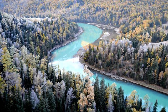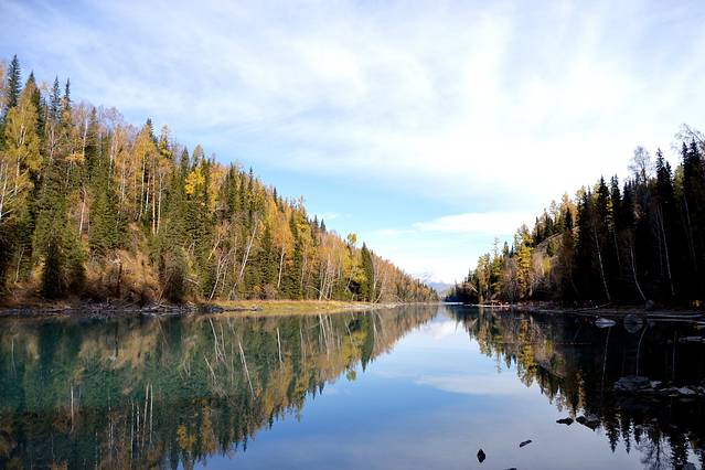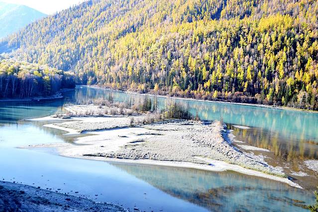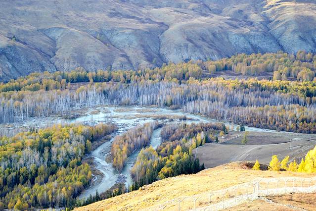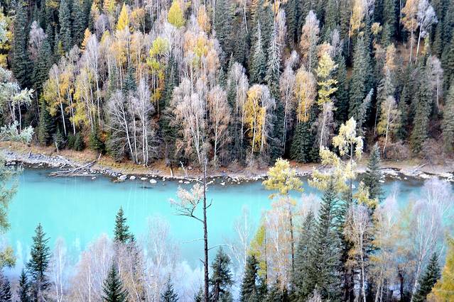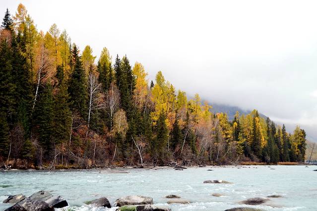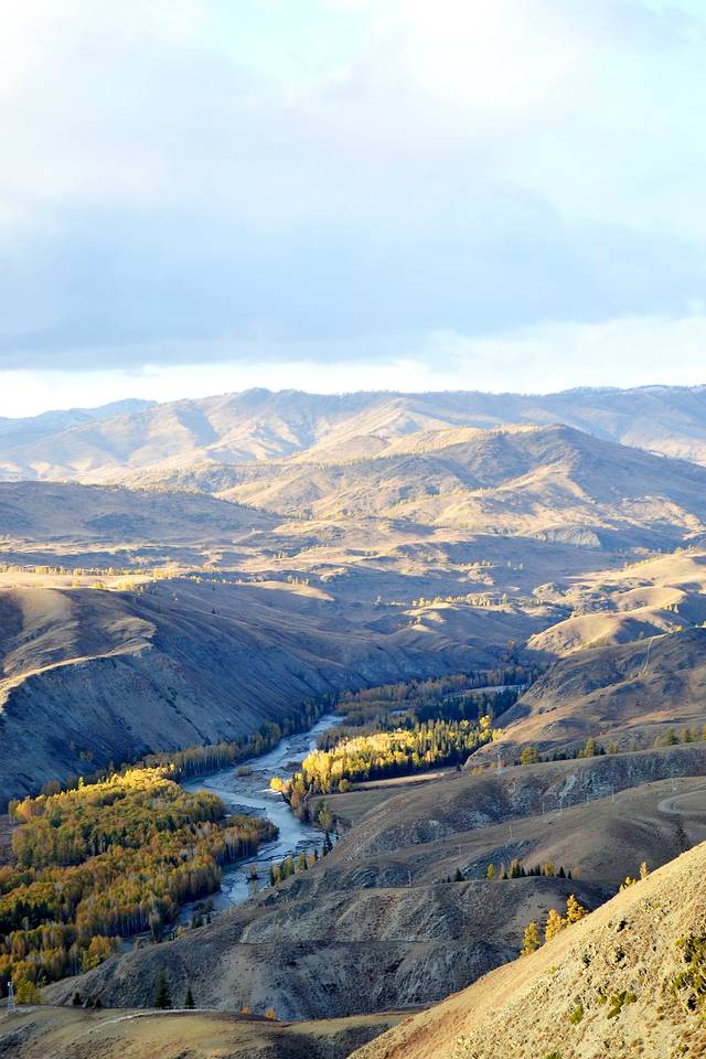 离白哈巴越来越近,天气也越来越好了,司机师傅在中哈大峡谷停了下车,让我们下去拍拍照。河流穿过大片白桦林,这样的中哈大峡谷好美,好像是上帝把调色盘打翻掉入了这里,把这里点缀成了一副恰好的油画。