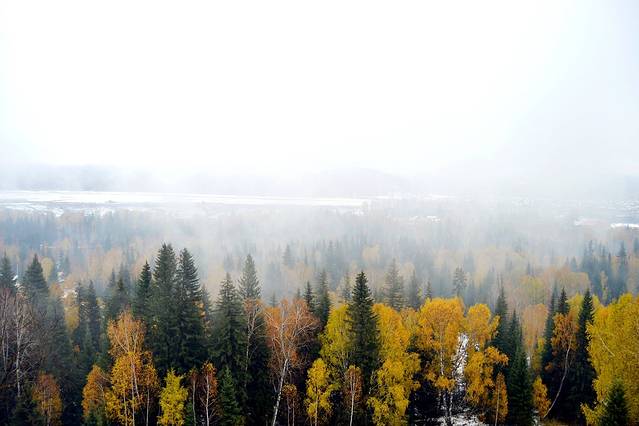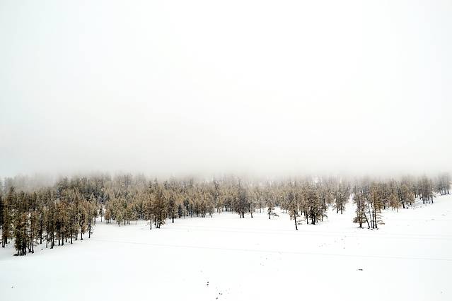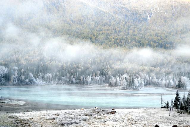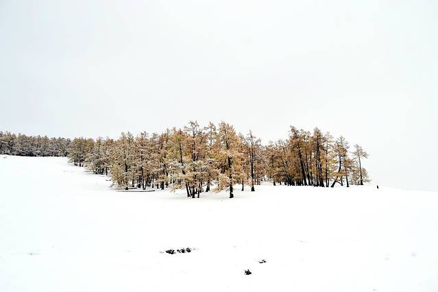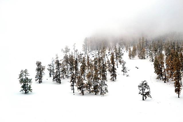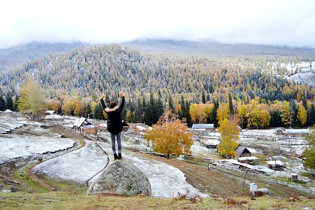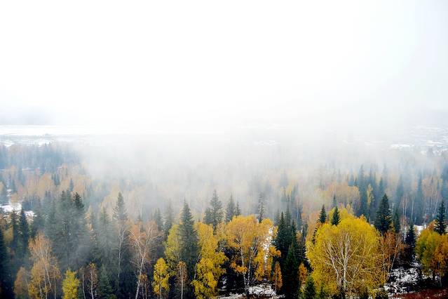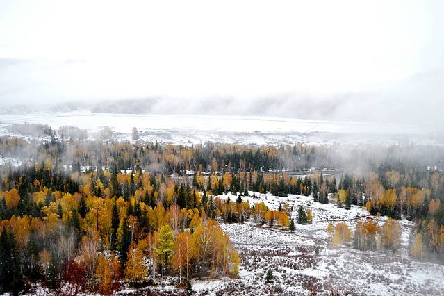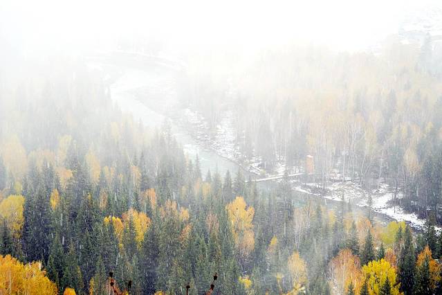 雪也越来越大了,本来开始还打着伞,后来觉得就这样感受下雪花飘落在身上,染着点点白色的羽绒服也是极美的。看着雾一会儿大,一会儿散去了一些,W说他朋友跟他形容的禾木就是“渐入佳境”,对这个词形容现在是禾木是在合适不过了。