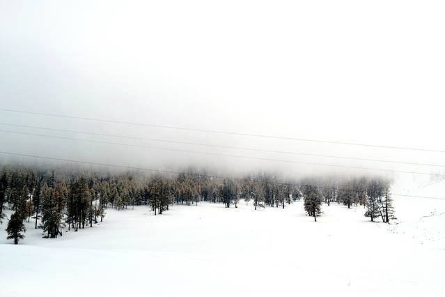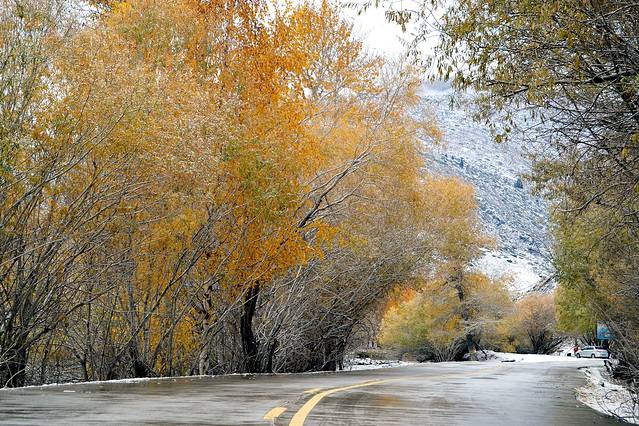 一路上堵得昏天黑地,走走停停,轮胎也上了防滑链。车子停下来的时候,我们就下车拍照,历时3个小时,最终到了禾木门票站。