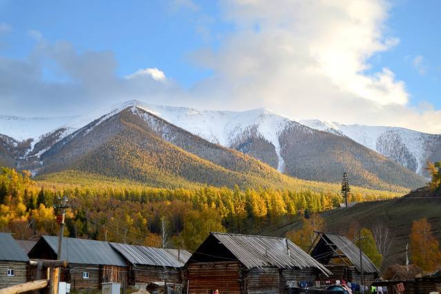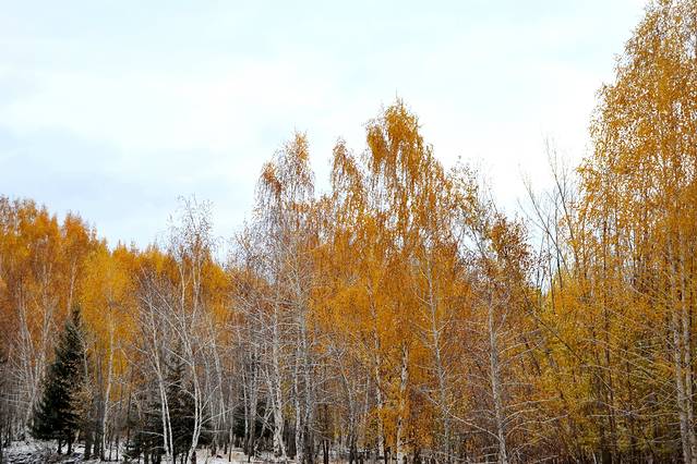 看见雪渐渐得化没了,好像天空也开始要出太阳了,蓝天白云一切该有的模样都有了。因为要去喀纳斯,就随便拍了几张去排队坐车了。