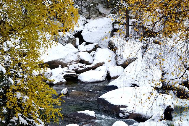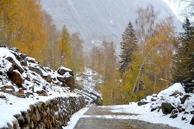 走着走着,人也越来越少了。走着走着,就开始下雪了,比白哈巴的雪下得更大,还可以接着雪花掉落在手心。我们俩激动坏了,一路上各种拍,相机拍完,还要用手机拍,必须要在朋友圈显摆显摆下,给我大重庆的朋友们看看这么大的雪,让他们羡慕嫉妒恨去。