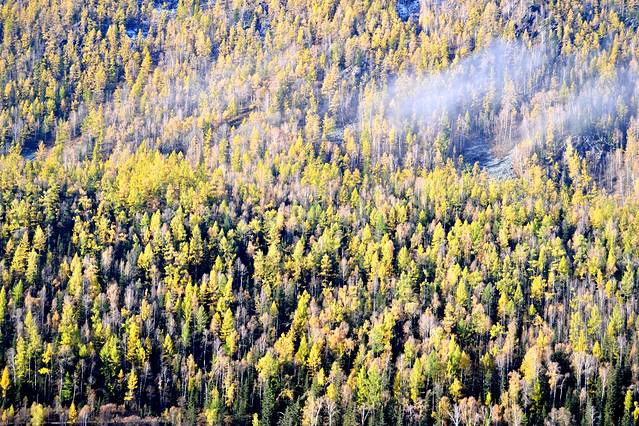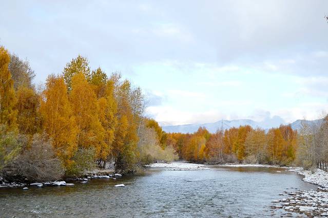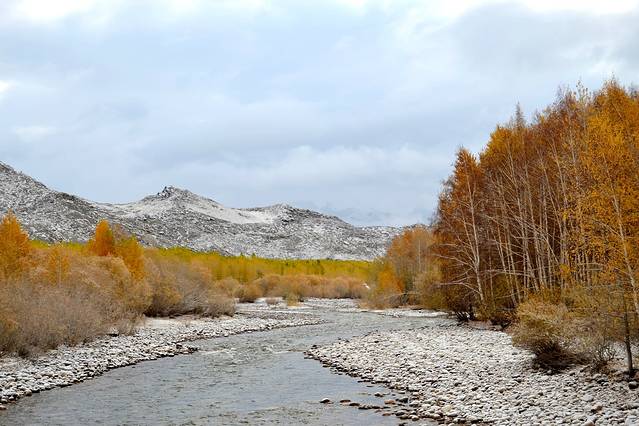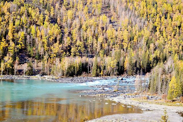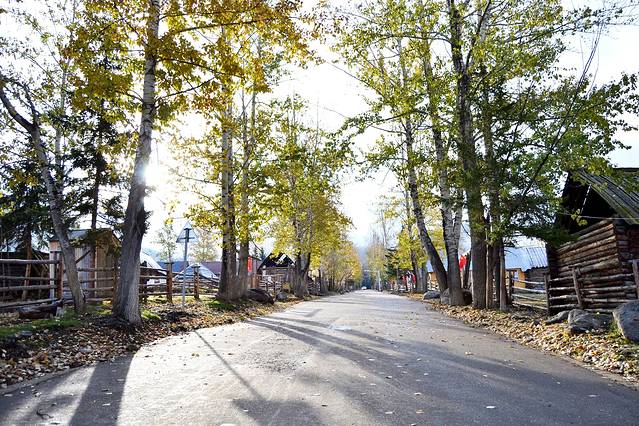 小镇的叶子比喀纳斯黄很多,到的那天下午,阳光很好,撒在公路上。在额尔齐斯河边,坐着晒了下太阳,捡了几个小时石头,却没有一个好看的。