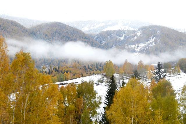终于坐上了去白哈巴的班车,一路的美景陪伴着,一会儿下雨,一会儿下雪,一会大晴天。窗外摩托车上的维族小孩,一张这边特有的脸颊,跟我挥手带着那天真的笑脸冒雨前行;边防士兵冒着大雪在外执勤,一个一个的挨着查身份证,有一双不符合他年龄的面孔与双手;车上的维族大叔,特意坐车去哈巴河购买的食物,满载而归的跟司机师傅用方言聊着天。