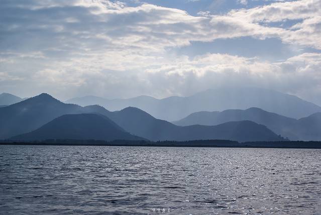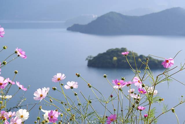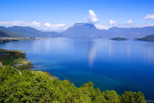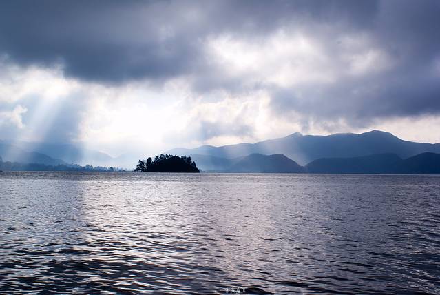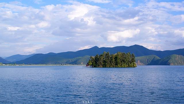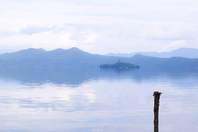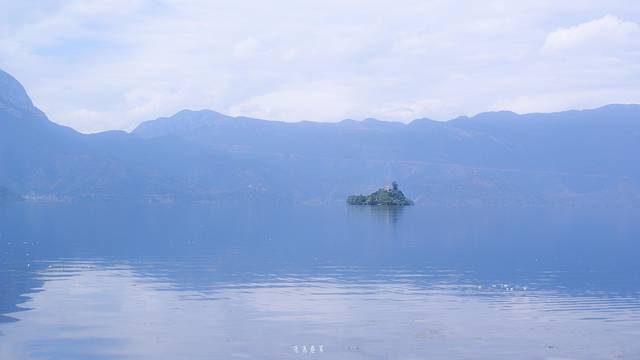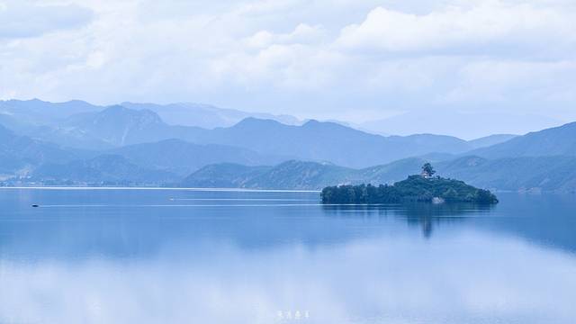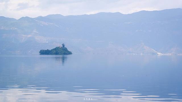 岛屿像一页轻舟 懒懒的浮于水面 在后方烟云中的山峦映衬下 更显苍翠