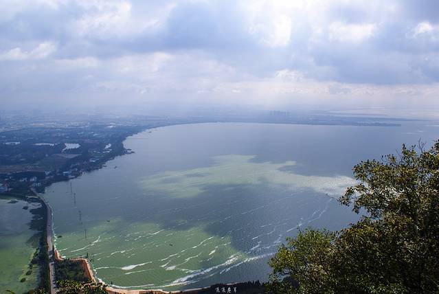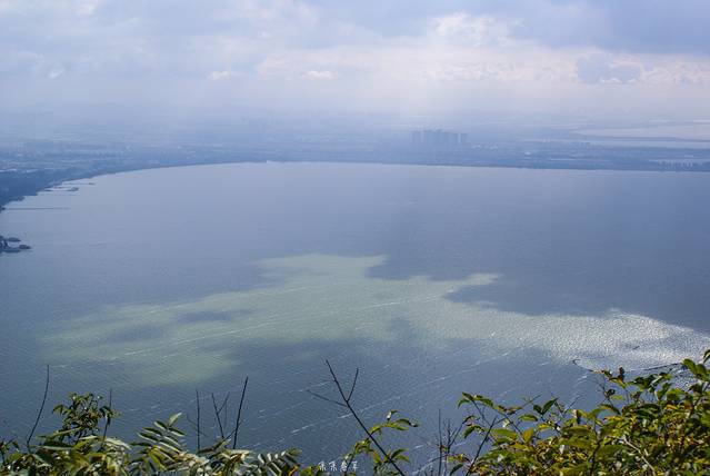 登高遥望。此时太阳刚好透过云层洒下几束光线,滇池独有的色彩像魔术般逐渐显现。