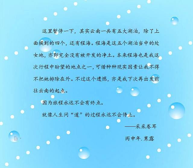 本游记采用纪要式,也就是“传记体”写成。因为这次主要希望让大家和我一起感受云南呈现给人类的各种美好而变幻的“水”,所以在正文里,不会严格按照行程的时间先后顺序记述,请大家见谅,对行程上需要帮助的亲可以留言给我,我一定会尽我所能知无不言。不过还是要偷偷告诉大家,这次出行照片多多。所以,如果您能把游记重头到尾都看完,我还是挺开心的,哈哈。