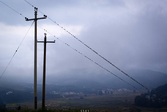 无心扫到之景。电杆上的一群小鸟,在阴霾中欢歌,充满活力。