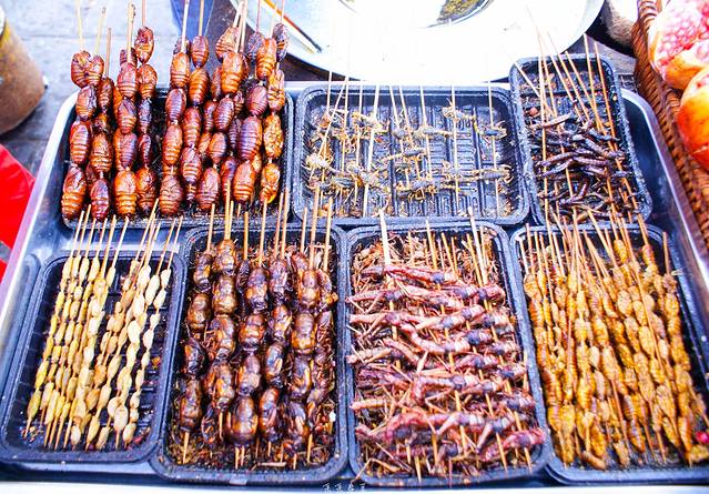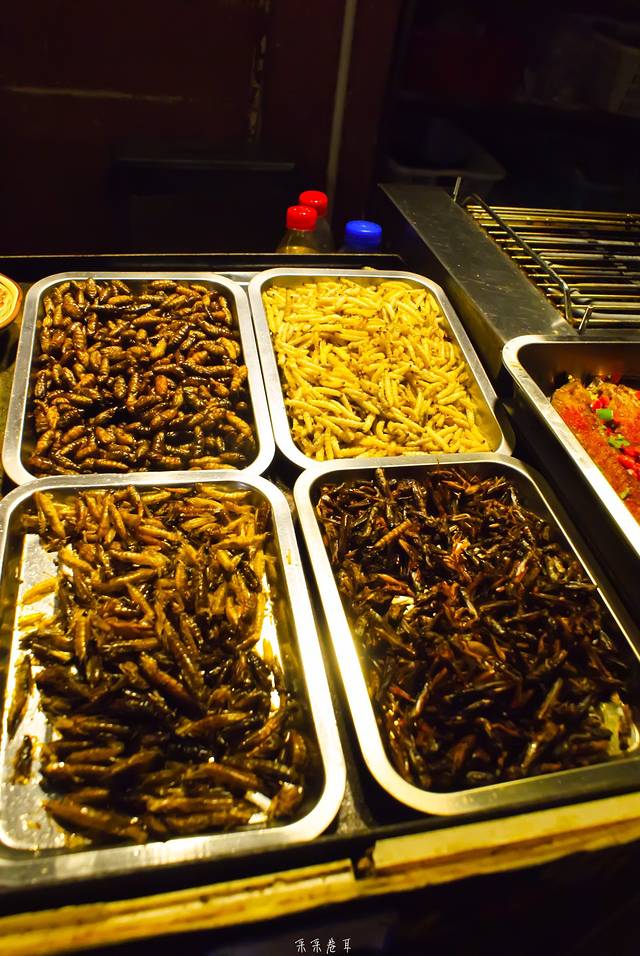 推荐蝉蛹,口感既富有弹性又有点软糯,味道香香的,嚼着挺带劲,有滋有味:)