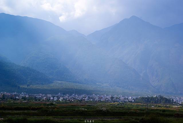 阳光被云雾弥漫为朦胧烟尘,远处的苍山好似在仙境之中;