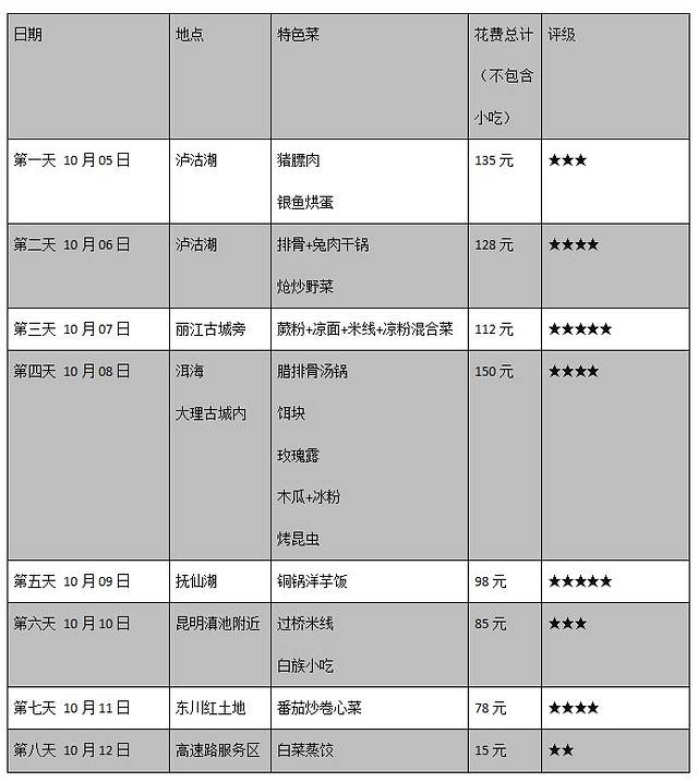 2 重要等级★★ 花费一栏指的是每天晚上正餐的消费。不含小吃,也不含午餐的花费,因为午餐时间一般都在外游览,所以通常都是以当地小吃为主,属于边走边吃。